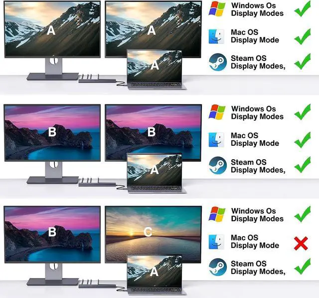 4K Triple Extended DisplaysNo need to download any driver, just connect to 2 HDMI ports and you can use the dual monitors in 4K@30Hz or a single monitor in 4K@60Hz. Mirror mode and extend mode can be used based on your needs. NOTE: Dual extend display only supports Windows OS, it doesn't support Mac OS.