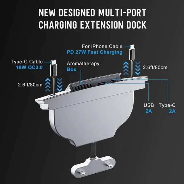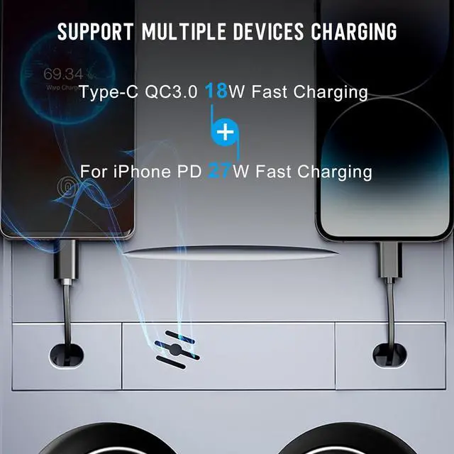 Multiple Ports and Retractable CablesThis USB HUB has 2 fast charging cables, with a 27W Fast Charger PD cable for iPhone and an 18W Fast Charger Type-C data cable. It also provides you with a USB-A port and a Type C port so that you can enjoy your trip in the car with your family and friends.