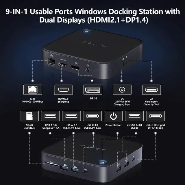 USB C Docking Station Dual Monitor: 9-in-1 for Windows MST Dock with 8K HDMI 2.1+DisplayPort 1.4, USB 3.0 SD 4.0 Card Reader RJ45 Ethernet Power Delivery Charge for Lenovo, HP, Dell, Surface