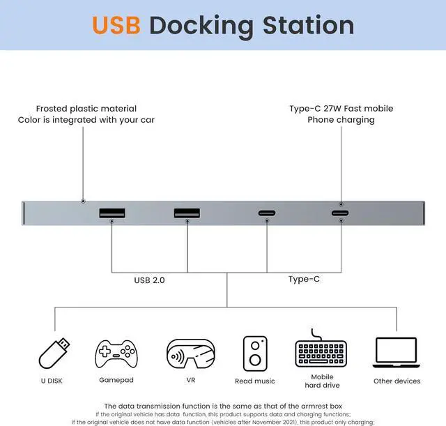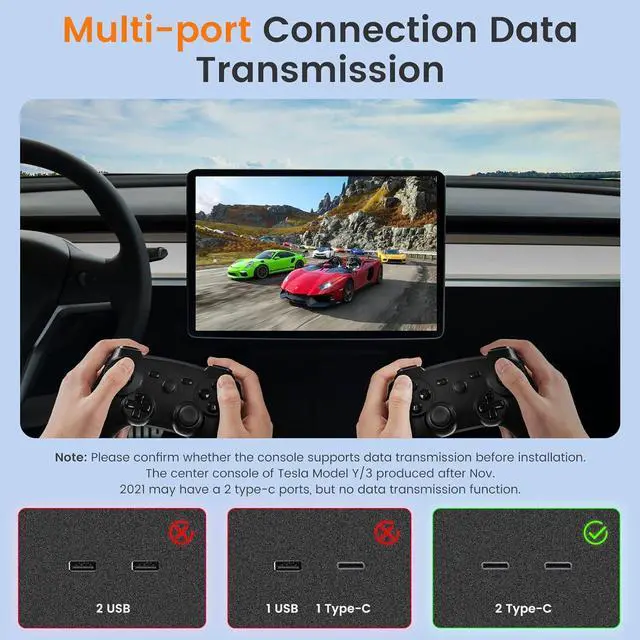 SPECIFICATIONFit for 2021 2022 2023 Tesla Model 3 and Model Y. It has 1 fast charging USB-C port, 1 5V3A USB-C port and 2 5V3A USB-A ports, no data transfer function. (MIND YOU Tesla has canceled the data transmission function on the console of Model 3/Y that built after November 2021, hubs can\u2019t recover the data transfer function.)
