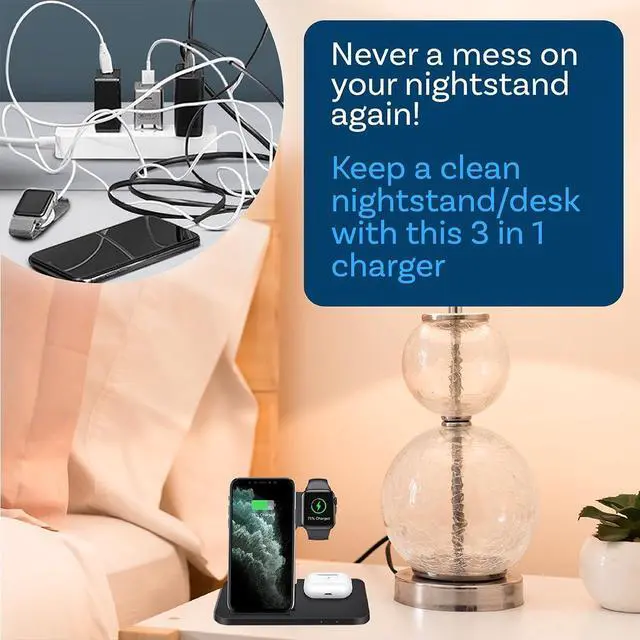 Are you looking for an organized wireless charger compatible with iPhone, Apple Watch and AirPods? Then this 3-in-1 wireless charging station is exactly what you're looking for. The charger is compatible with all phones that support wireless charging. It is also compatible with any type Apple Watch and all AirPods that support wireless charging, so you can charge all your devices in one place at the same time.