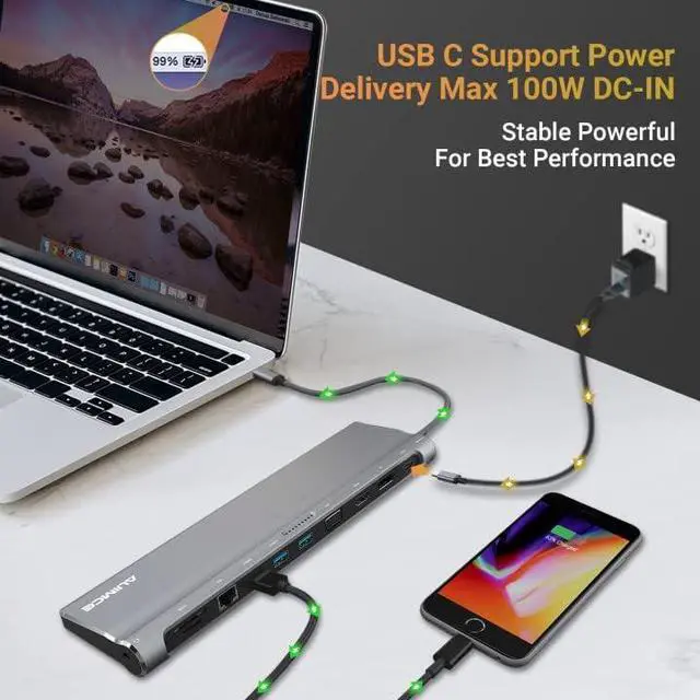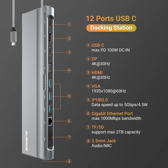 Universal USB C Docking Station Support 4K Dual Monitors for HP/Lenovo/Dell/ASUS and Mac OS Laptops 12-in-1 docking station 3 monitor is a great compliment for your USB-C/Thunderbolt 3 Laptops. Plug and use this USB C dock directly, no need installs any driver or software. HDMI(3840 x 2160/4k@30Hz) + DP(3840 x 2160/4k@30Hz)+VGA1920 x 1080/2K@60Hz) from your USB C devices. Support triple displays for your laptops. 3 x USB 3.0 ports (up to 5Gbp/s) connect smartphones, tablet, hard drives, for effortless data transfer with USB-C port, it also allows you to connect keyboard or mouse without any lag of this laptop docking station. SD/TF Card reader (load 1G movies for a few minutes) for USB-C/Type-C/Thunderbolt 3 devices to access files, quickly view your photos or videos, perfect for Photographer or Video editor, etc. USB C To Gigabit Ethernet Adapter, support 10/100/1000Mbps bandwidth, provide stable wire ethernet condition, make your work more effective. The 3.5mm Audio Port with mic and audio-out function. Support max 100W charging for your laptops while using other ports of this USB C docking station. Triple Display Docking Station for MacBook Pro/Air Laptops For Mac OS laptop, it can ONLY support extend ONE different monitor, display like A+B+B+B. Or support mirror mode, display like A+A+A+A, all three monitors can up to 4K/30Hz resolution. There of the monitor can work simultaneously to expend your workstation with multi screens.