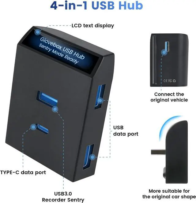 4-in-1 USB HUBThis is a 4-in-1 Glove Box USB Hub, so that the original car from a port into 4 ports, two USB 2.0 ports, one USB 3.0 port and a type-c port, faster data transmission, and adapting the original car memory stick USB 3.0 interface,Suitable for smart phones, ipads, gamepads, Macbooks, digital cameras, enrich your in-car entertainment life and saying goodbye to clutter and confusion.
