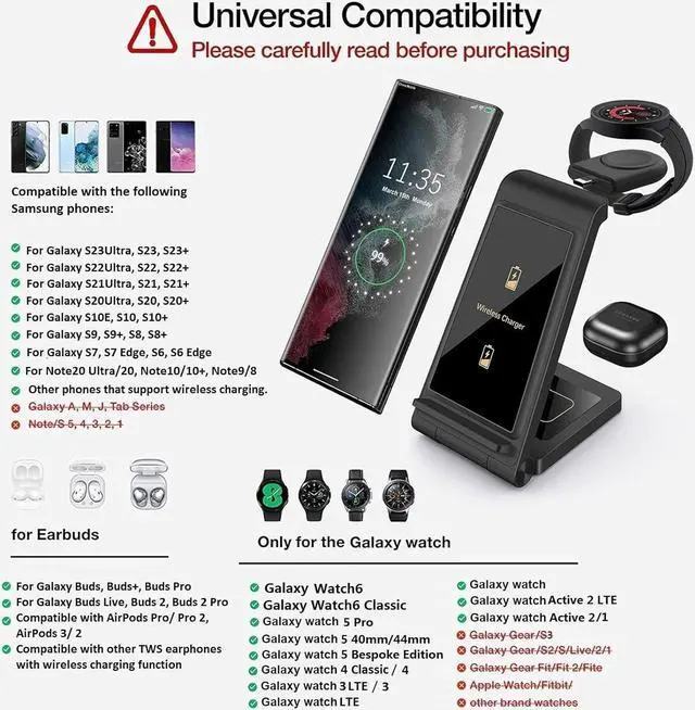 5.Samsung mobile phones support 10W and 15Wwireless charging, and thecharging speed will be slower than chargingdirectly with a chargingcable, which is normal.