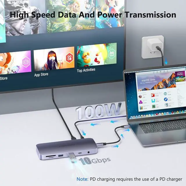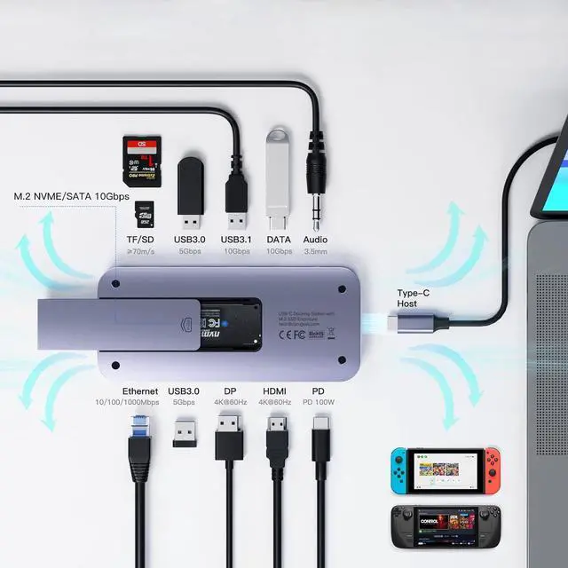 12-in-1 Laptop Docking StationThis USB C Hub has 100W PD+HDMI(4K@60HZ)+DP(4K@60HZ)+USB-C(10G)+USB3.0+2*USB3.0+Audio+SD+TF+RJ45+DATA+ M.2 SSD, rich interface types can fully meet the various needs of daily entertainment and game work, bringing more convenient and convenient user experience.
