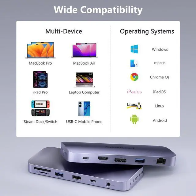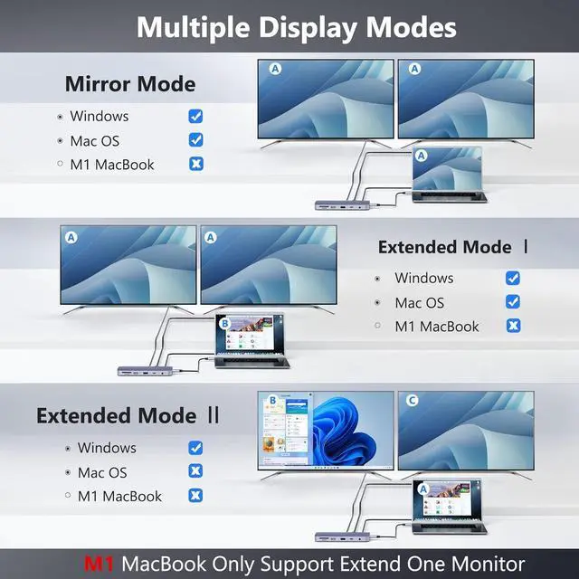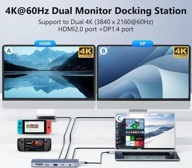 Supports 4K@60Hz Dual MonitorsWith this docking station, you can easily mirror or extend Type-c laptops, Macbooks, switches, and steam decks to external screens with dual 4K@60Hz displays. Note: M1 Macbook only supports the expansion of an external display (notebook display + external display). 4K@60Hz external display needs to be supported by the output interface to be able to output (HDMI2.0, DP1.4).