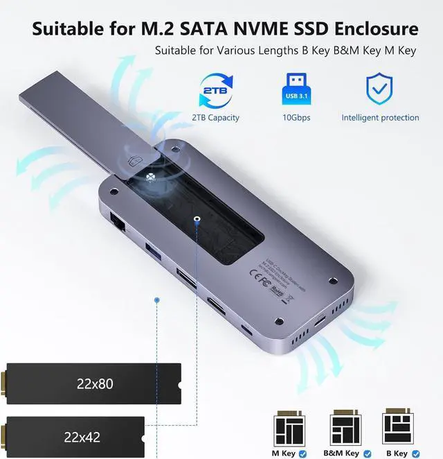 SATA NVMe M.2 SSD EnclosureThe USB C docking station turns the M.2 SSD into a mobile hard disk and brings 10Gbps high-speed data transmission. It supports 22x80 and 22x40 M.2 SSD sizes of NVME and SATA dual protocols. Easily expand Macbook, Ipad, Laptop Computer, Steam Dock /Switch, and USB-C