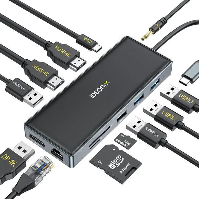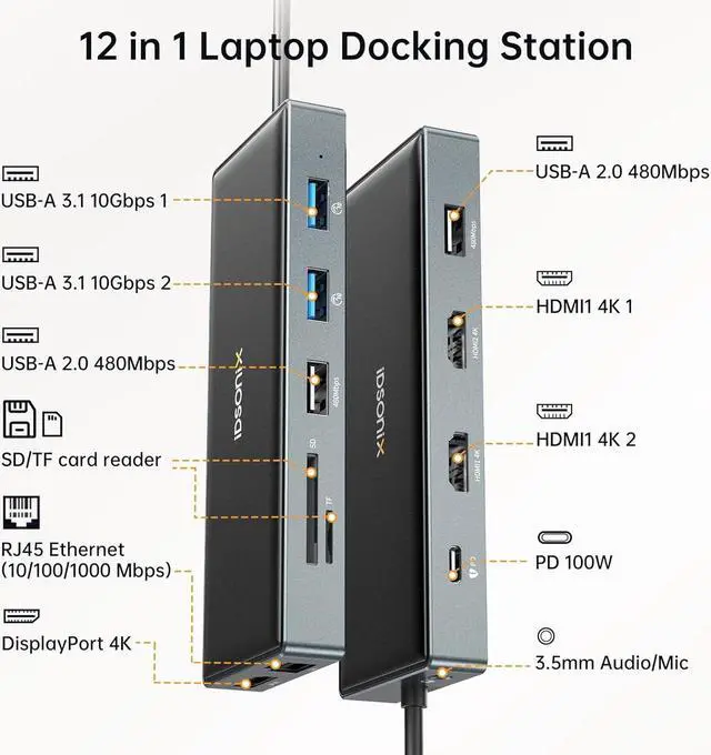 12 in 1 Docking Station Dual Monitor - Can expand your computer from 1 TYPE-C port to 12 multi-function ports, docking station with 2 HDMI 4K, DisplayPort 4K, PD 100W, USB-A3.1 ×2, USB-A2.0 ×2, SD/TF, RJ45×1, 3.5mm Audio/Mic. All usb hub ports can work at the same time, perfectly compatible with your computer