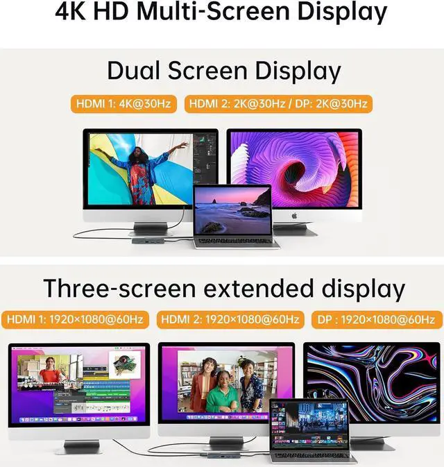 4K HD Multi-Screen Display - Combines three video output ports, 2HDMI and one DP port, 4K HD output.Different from other brands, our laptop docking station supports the Triple display both Mac OS and Windows systems. PLEASE NOTE: Windows system, AMD processor, usb c hub docking station supports quadruple display MST; Windows system, Intel processor, usb c dock supports Triple display MST.