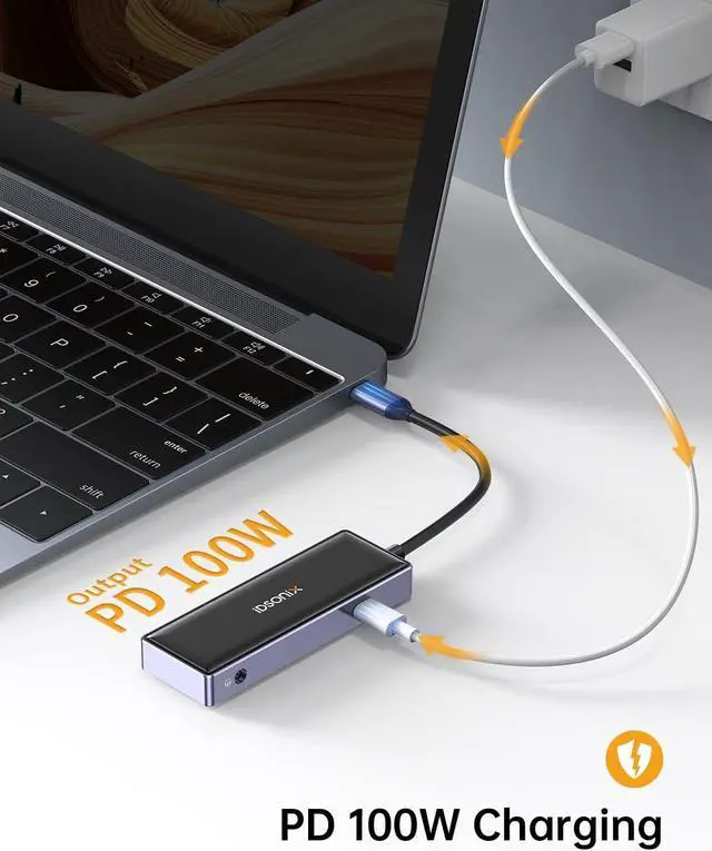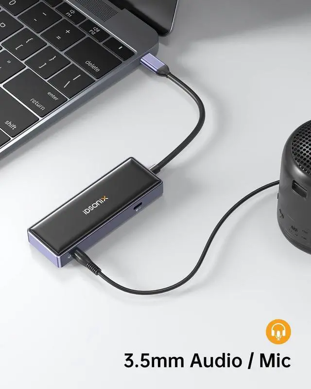 100W POWER DELIVERY AND 3.5MM AUDIO: This multiport USB C adapter provides 1 Type C pass through Female port by which you could securely charge connected MacBook or other Type C laptops. Support 100W power in, power out (charging) is limited to 87W for safety. Also, there is a 3.5mm Audio port for you to put in your wired headset, so that you can enjoy music without distur