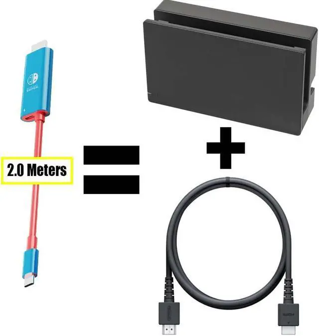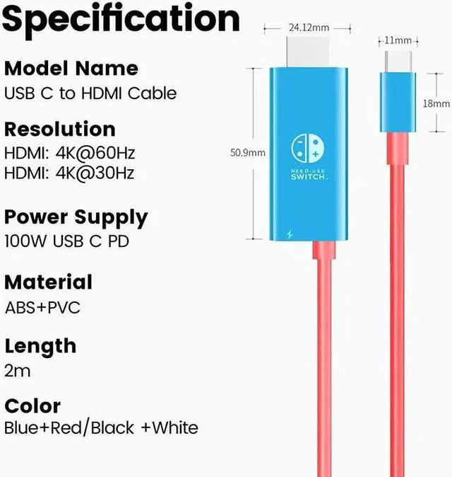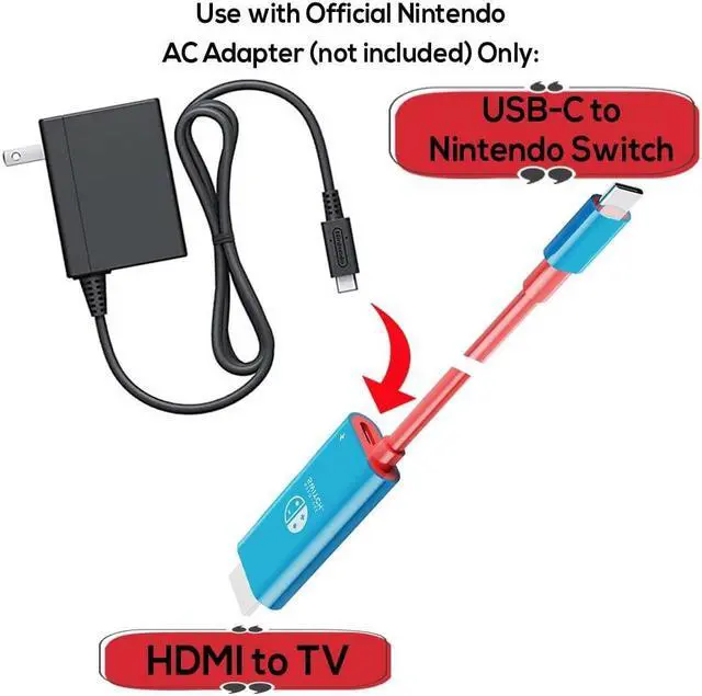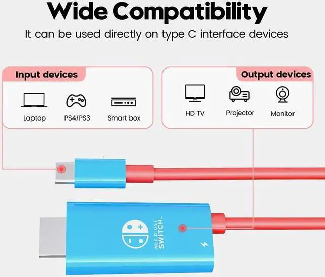 Eliminate the bulky Switch dock (or 3rd party docks) and avoid bricking or damaging your Switch with the EhYoo USB C to HDMI converter cable. The product works with the official Switch AC adapter. -HDMI output interface: up to 3840*2160, 4K@30HZ or 1080P@60Hz. -USB-c charging interface: supports up to 20V5A/100W -1.8 meter length Product manual: 1. Compatible with Nintendo switch game console, charging port (MUST USE WITH ORIGINAL NINTENDO SWITCH AC ADAPTER) and HDMI port at the same time, the resolution is up to 1080P@60HZ. 2. Plug and play, no need to install drivers. 3. The interface adopts gold-plated technology, anti-corrosion, provides durability and ensures stable signal transmission, which is very suitable for you to experience amazing videos and images without delay. 4. For PD fast charging, please make sure that both your USB C device and charger support USB power transmission specifications. Note: Not compatible with Nintendo Switch LITE