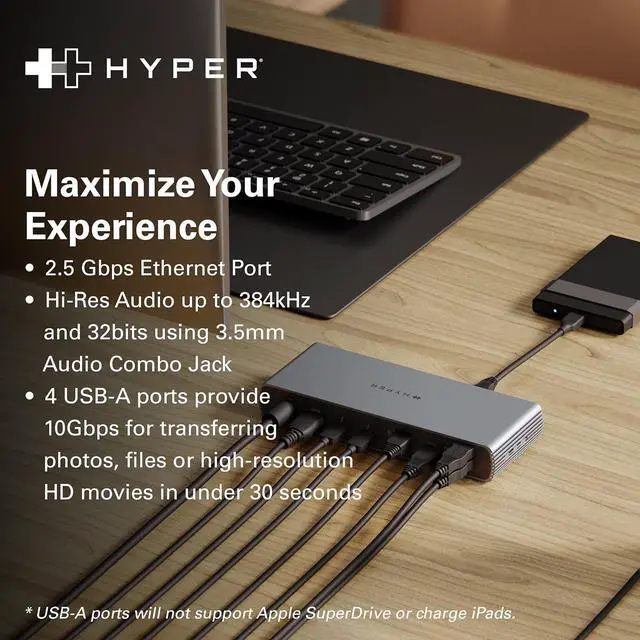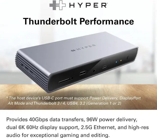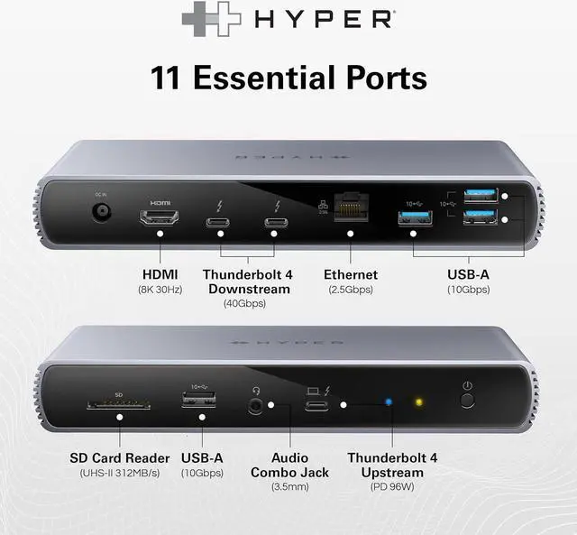 The HyperDrive thunderbolt 4 hub usb c docking station with power delivery thunderbolt for mac is designed for enterprise businesses, PC gamers and video editors looking for an advanced connectivity solution that delivers maximum bandwidth and epic display resolutions. This is a docking station for macbook pro, docking station for macbook air, docking station for mac, docking station dual monitor, dock station for macbook pro, dock for macbook pro. This dock for mac usb c docking station laptop hub usb c dock thunderbolt 3 docking station for mac features 2 Thunderbolt 4 Downstream ports capable of 40Gbps data transfers and 32G PCIe transfers, and 1 Thunderbolt 4 Upstream port that provides 96W Power Delivery charging for your host device. Enjoy gaming and video editing like never before with computer docking station for laptops dual monitor docking station multiple monitor dual screen dock dual monitor adapter for macbook air 4K 60Hz display support through displaylink docking station for mac m1, HDMI dock or Thunderbolt, an ultra-fast 2.5. Gigabit Ethernet connection, and high-resolution audio with the ability to choose between lifelike 8K 30Hz resolution or 4K 120Hz resolution for faster rendering with less blur. This hub with sd card reader also has 4 USB-A ports provide 10Gbps for transferring photos, files or high-resolution HD movies in under 30 seconds. HYPER creates award-winning, cutting-edge IT and mobile accessories that focus on compatibility with Apple, portable power, and connectivity.