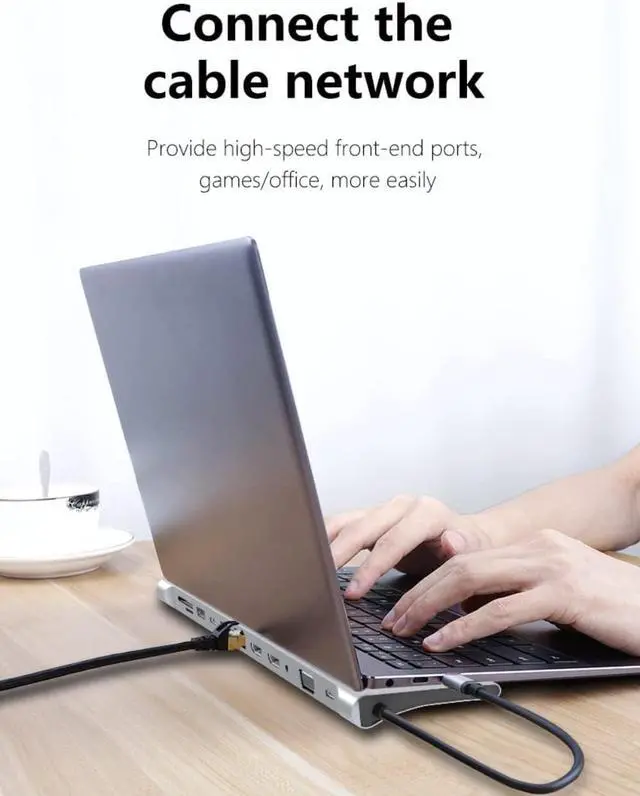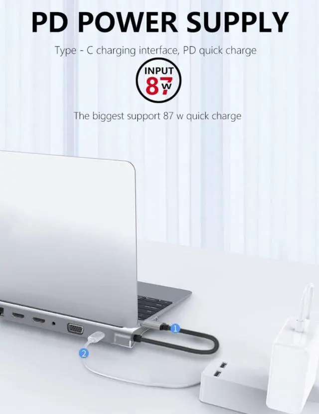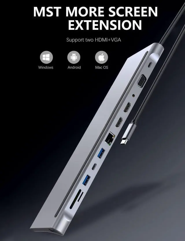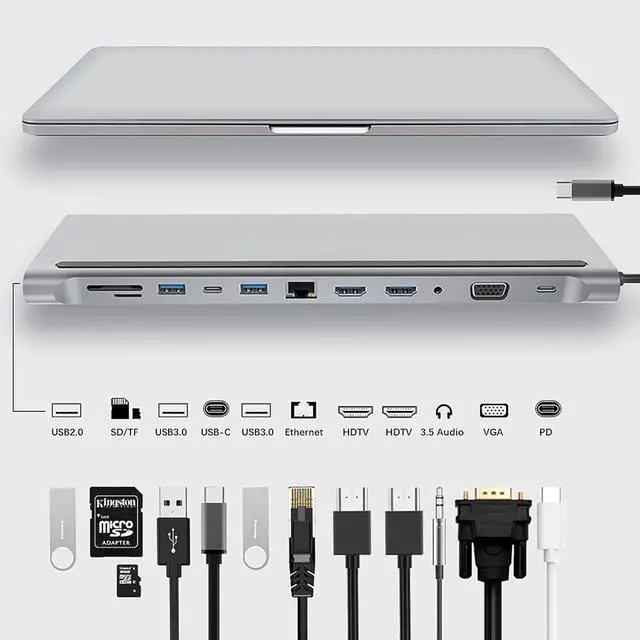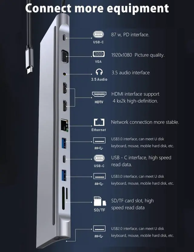 12 in 1 Type-c hub adapter with 2 x 4K high-grade multimedia interface port, 1 x VGA, 1 x RJ45 Ethernet, 3 x USB, 1 x USB C, 1 x USB C 87W PD charging, 1 x SD Card Reader, 1 x TF Card Reader, 1 x 3.5mm Audio Port,Connect up to 12 peripherals with a single cable connection.Turn any MacBook or USB C enabled laptop into a mobile workstation with a simple plug and play connection!
