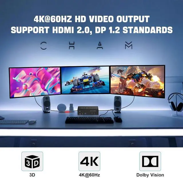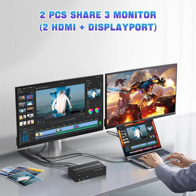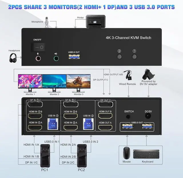 1. USB 3.0 HDMI DisplayPort KVM Switch Dual Monitor share one set of keyboard, mouse and dual monitors (HDMI+DisplayPort) between 2 computers or laptops;