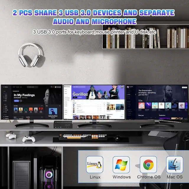 This kvm switch 2 monitors 2 computers with 3 USB 3.0 Ports for keyboard, mouse, printers, USB headsets or webcams.