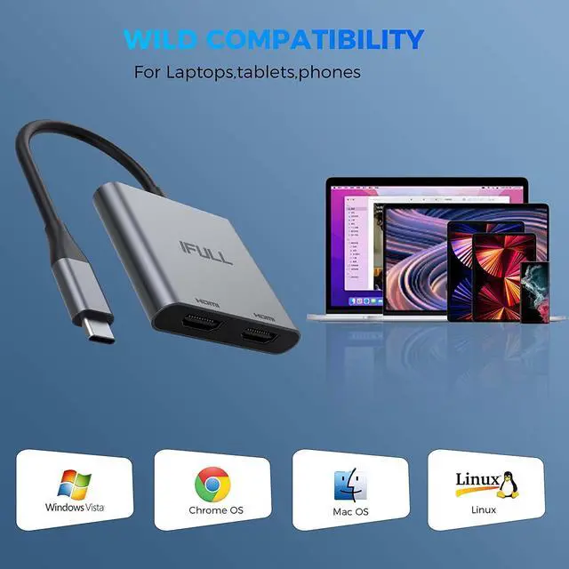 This USB C To Dual HDMI Adapter allows you to extend multiple different monitors. It is an ideal gardget for your new usb-c thunderbolt 3 laptops and a great gardget for your working or studying or entertainment. With advance chip, provide you more stable performance.