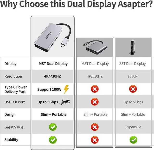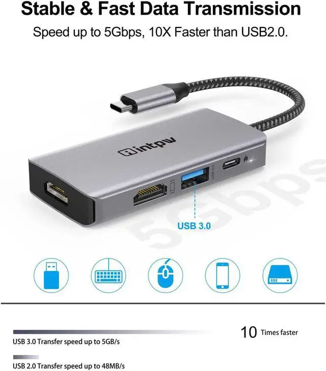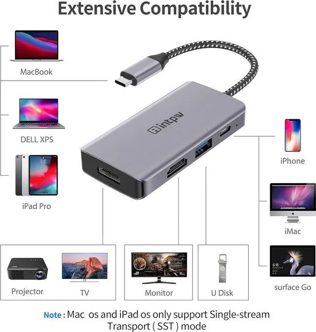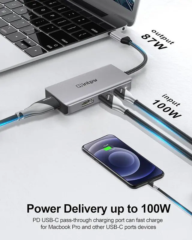 INTPW USB C to HDMI adapter for Macbook Pro/Air has dual HDMI ports, one USB 3.0 port and one USB C 100W charging port. With this dual monitor adapter, you can stream/extend video from your laptop to your TV/monitor/projector with 2 HDMI. You can use 1 USB 3.0 port with speeds up to 5Gbp/s to connect your hard drive or USB flash drive and provide 100W of pass-through current to your USB C laptop.