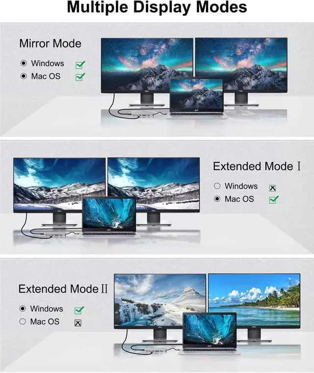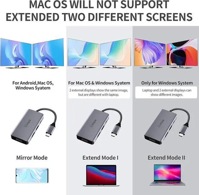 Please Attention: Due to Apple system limitations, its non-mirrored mode can only support 2 duplicate (mirrored) external displays.