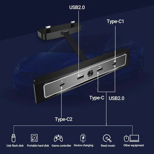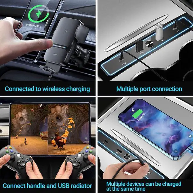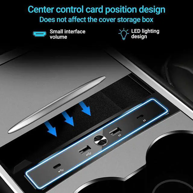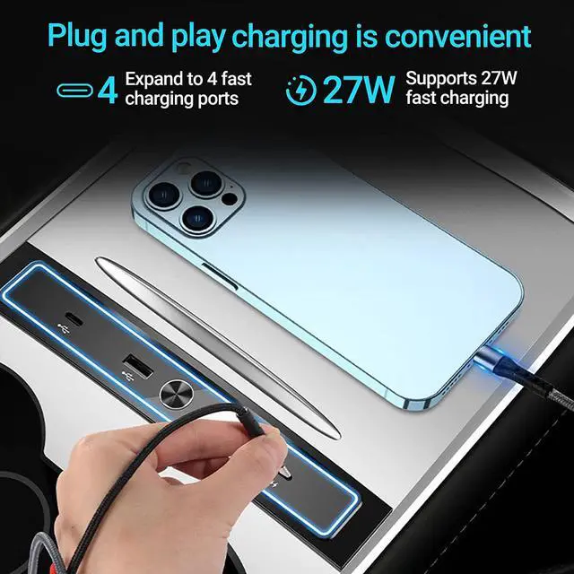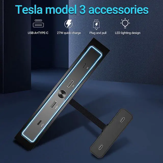 High Performance: This USB LED Hub is a model Y&3 accessories built specifically compatible with Tesla 2021-2022 Model Y and Model 3. It has 2 Type C ports and 2 USB ports. One of Type C ports supports 27W fast charging, 4-in-1 USB hub.