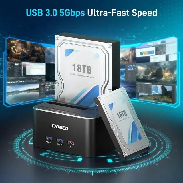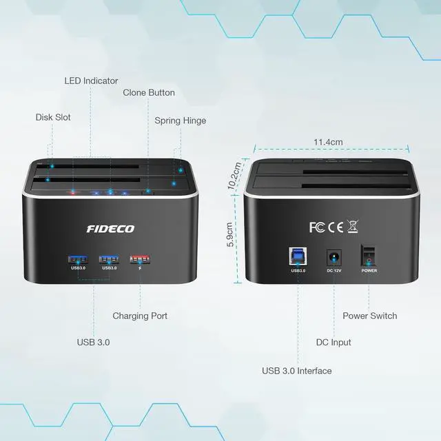 FIDECO hard drive docking station can support all 2.5/3.5 inch SATA I/II/III HDD/SSD.