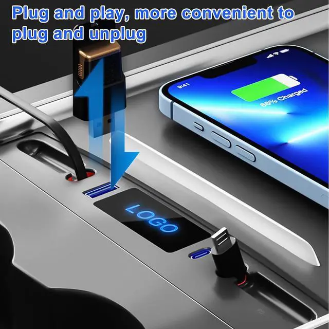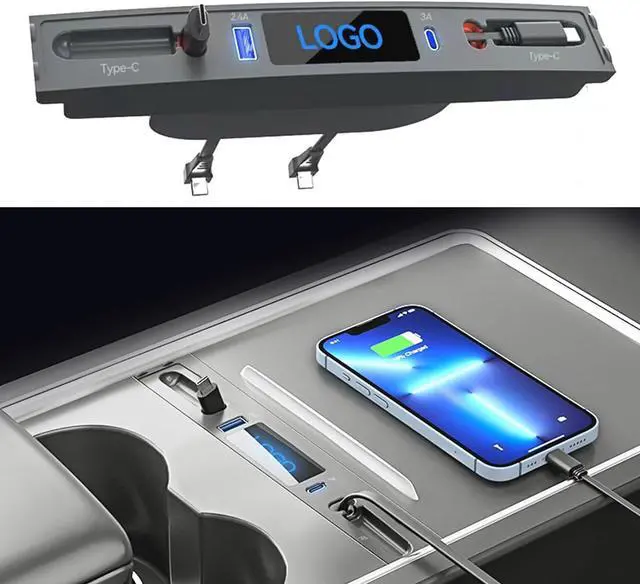 Essential Accessories for TeslaThe original center console only has two ports, can not meet the multiple device charging / data transfer, and our usb hub comes with two retractable charging cables and two external charging ports, which can meet your various needs at the same time.