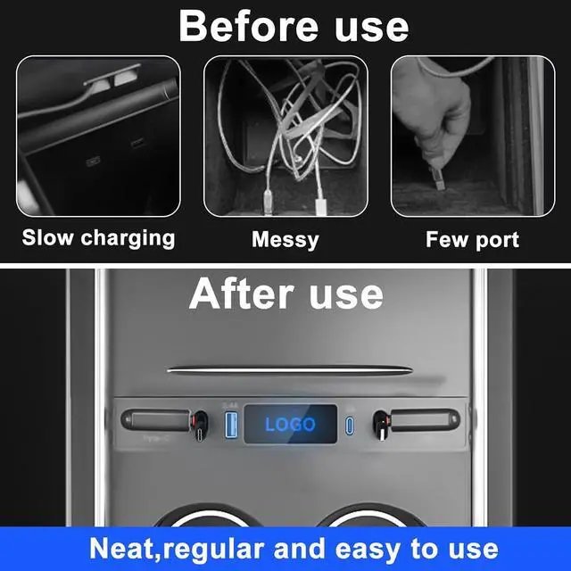 New upgrade This hub comes with two retractable charging cables and two external sockets, which help you get rid of the inconvenience and slow charging speed of the Tesla console USB hub, and bring convenience to the driver and passengers.