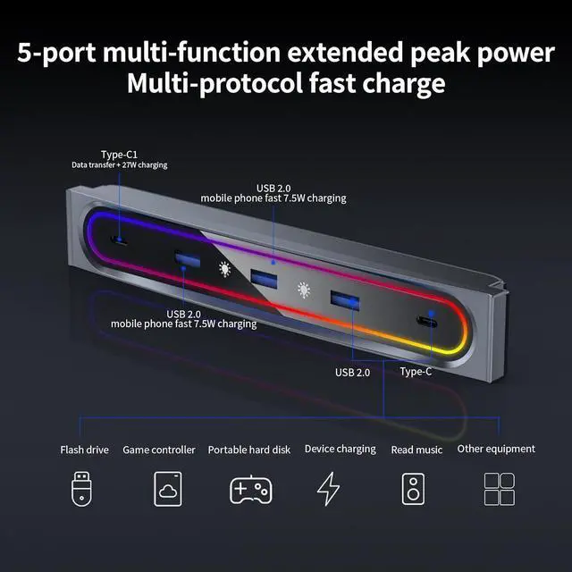 With 5 ports 3 X 5V 2A USB2.0, 1 X 7.5W TYPE-C1, 1 X 27W TYPE-C2. Perfect solution to travel interface problems.