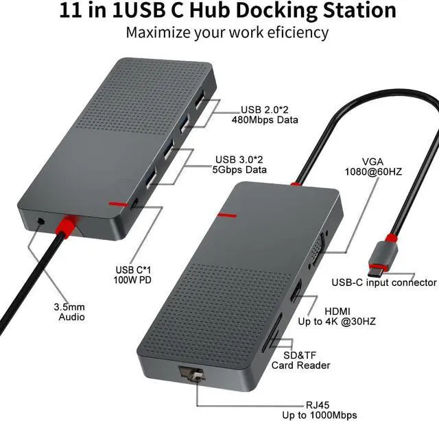 11 In 1 USB-C Hub The USB-C Hub Is Plug-and-play, No Drivers Required.All Expansion From A Single USB-C Port,you will get 1 HDMI output, 1 USB C PD fast charging port, 2 USB 3.0 type A Ports, 2 USB 2.0 type A Ports,1080p VGA port, 1 Ethernet port up to 1000M, 1 3.5mm AUX port and 2 SD/microSD card slots can charge your devices, transfer data and audio output. An ideal partner to deal with any problems you have.