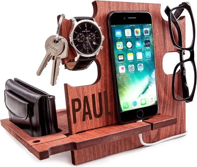 Greta Oto Personalized Wood Phone Docking Station Gift For Men Bedside Nightstand Charging Station Organizer Mens Accessories Phone Stand Anniversary Birthday Gifts For Dad Him Husband