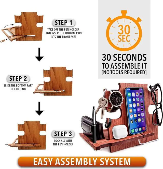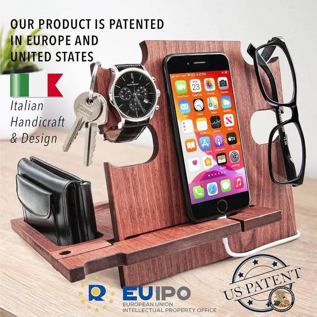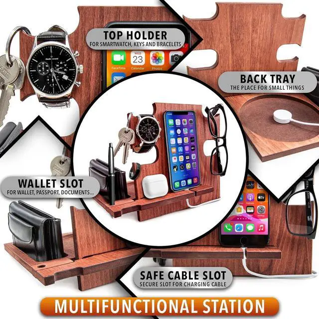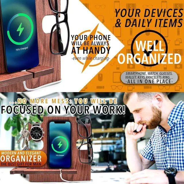 • BEST DESK ORGANIZER - This Docking Station keeps all your mobile devices in charge and it's a great solution for desk organization. All your daily items are organized and easy to find. The spaces are specifically designed to accomodate Glasses, Keys, Wallet, Coins, Rings, Watch and many other stuff
