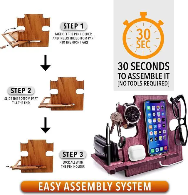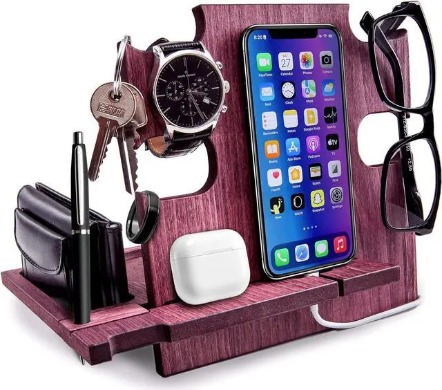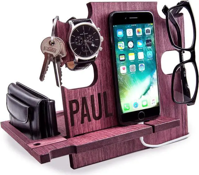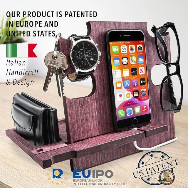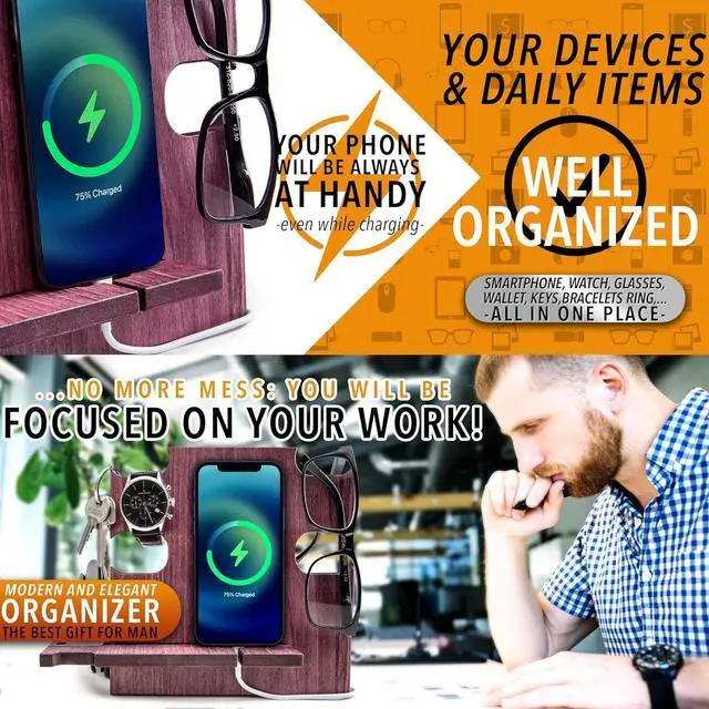 This wooden desk organizer is compatible with all kind of iPhone and android Smartphone. You can use it at home, office or wherever you prefer to keep tidy your personal items. It's also a phone holder and a charging station. A great gift idea for men who have everithing, from wife to her Husband or Fiancè to Boyfriend. A nice present for Dad from his beloved daughter. For Boss, Uncle, Brother, Groomsmen or Friends. Make your special man happy with a special gift that you can personalize with a name or short text that will be engraved on the docking station.
