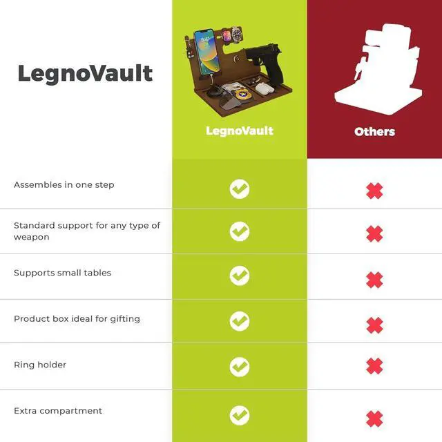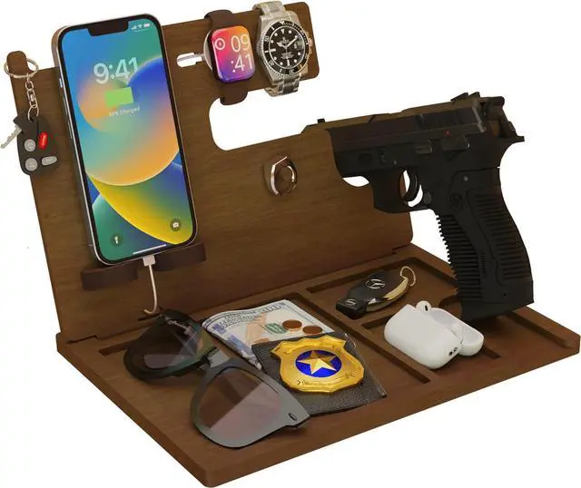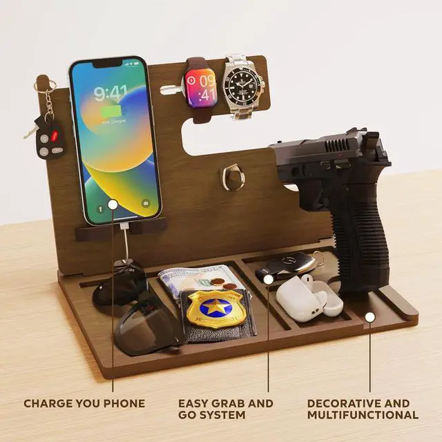 Our phone docking station is designed to securely hold your phone, gun, watches, etc. and provide you with a no-hassle way to recharge it as well as offering plenty of space to organize and store your keys, ring, wallet, glasses, coins and more. Its suitable for any space whether in your home or office.