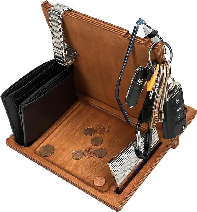 The mens phone and watch docking station features a built-in mirror, a pen/ pencil holder & groove, a hanger for keys and small objects and one also for glasses. The desktop organizer also has a phone holder with a charger slot for convenience and efficiency while working. His cards, wallet also get a tray. A crafty space for his watch also features to the side.