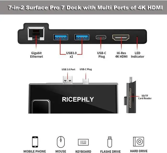 Ricephly 7-in-2 Surface Pro 7 Dock with Multi Ports of 4K HDMI, LAN RJ45 Gigabit Ethernet, USB C PD, 2x USB 3.0, SD/TF/Micro SD slot Card Reader. Meet Your Demands to Expand the Productivity of Your Surface Pro 7.