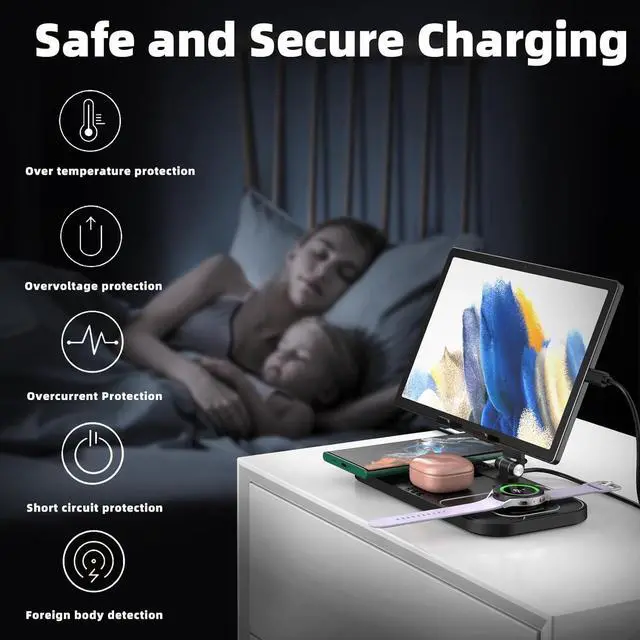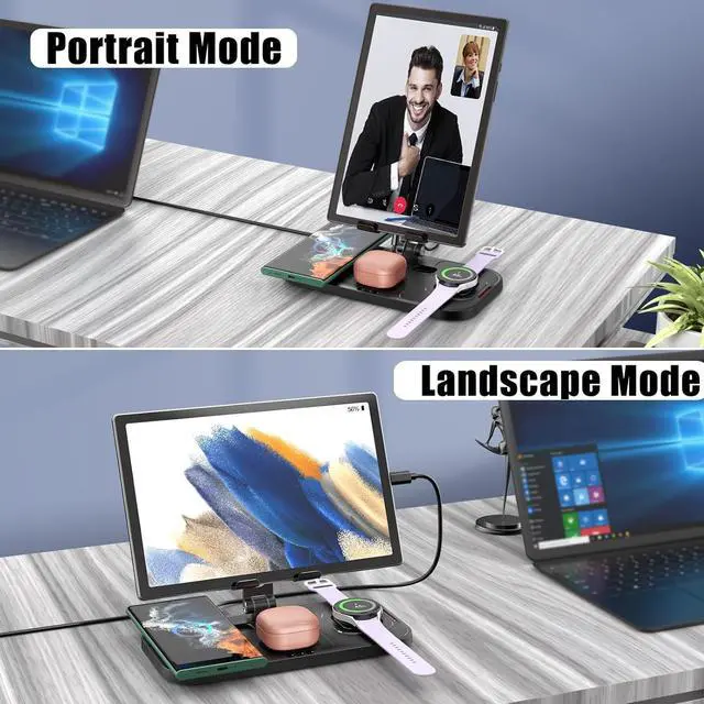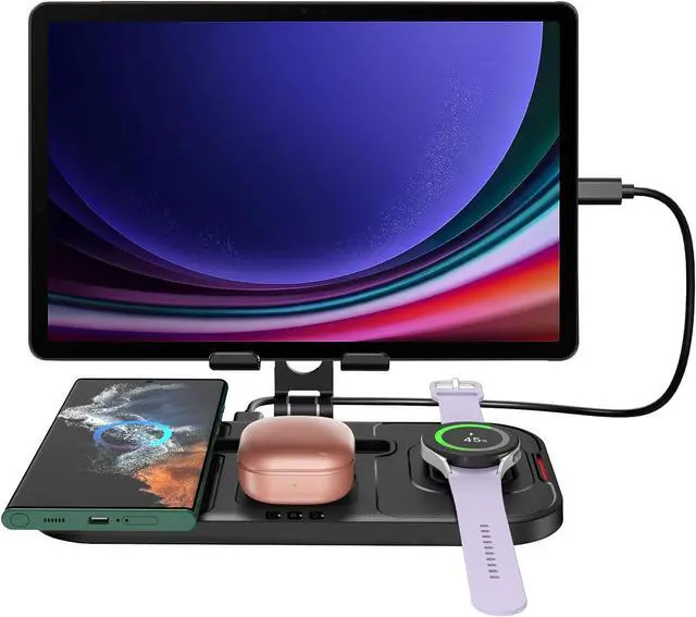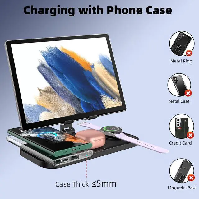 4-in-1 Wireless charging station for Samsung users is designed with cooling vents to keep the temperature under control and safe while charging. Don't worry about the phone or charger overheating while charging.
