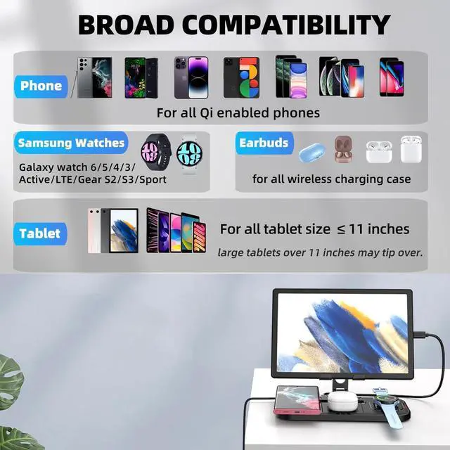 Next page1For Cellphones2For Tablet/iPad3For Samsung Watch4For Wireless Earbuds For safe and more efficient charging, We recommend using our 36W charging adapter (including the package). Or use at least 30W adapter or more, otherwise, it will not work properly
