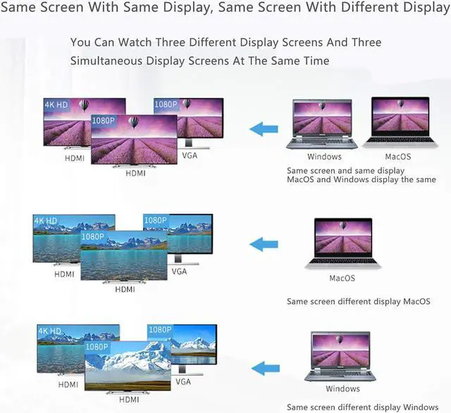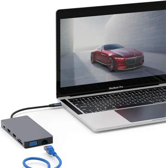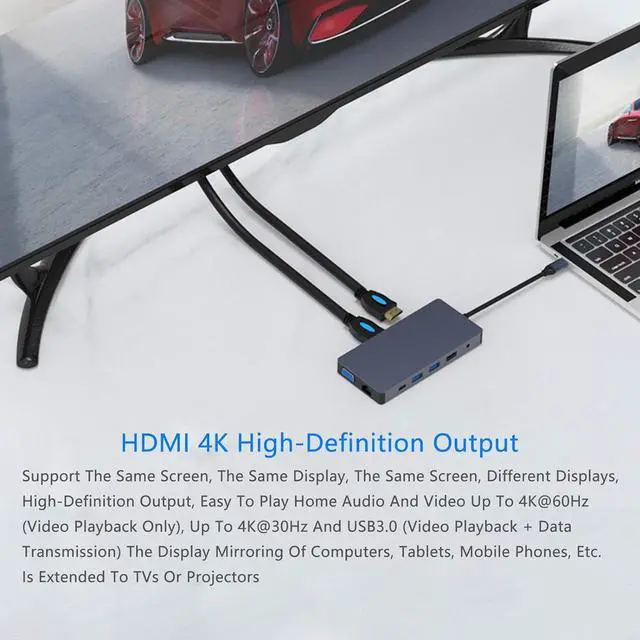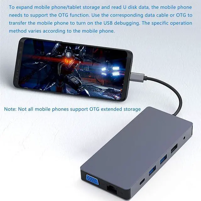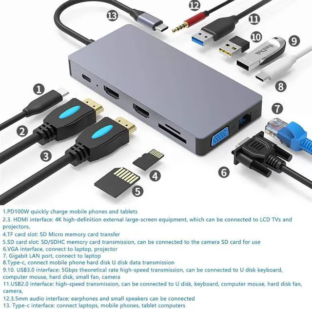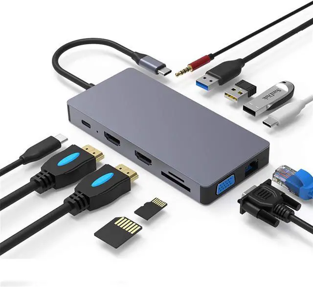 • 12-in-1 multifunctional docking station: Type-c PD charging, Type-c data transmission USB3.0, USB2.0, Ethernet port, SD TF, VGA dual HDMI, 3.5mm audio