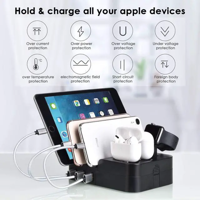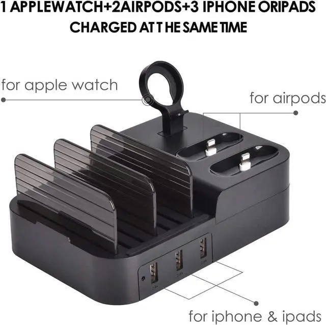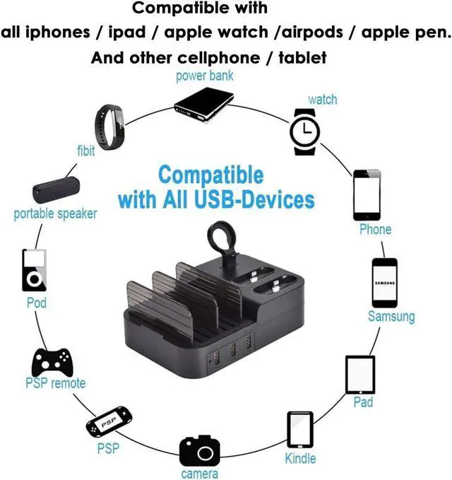 Compatible with iphone, ipad, Apple watch, Apple pencil and other cell phone or tablets, smart watch, bluetooth speaker, headphone, power bank...Keep all your devices in one place and charge them, make your desk clean and tidy, keep everything organized.