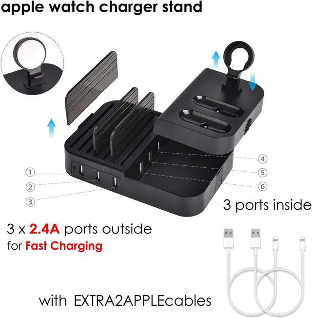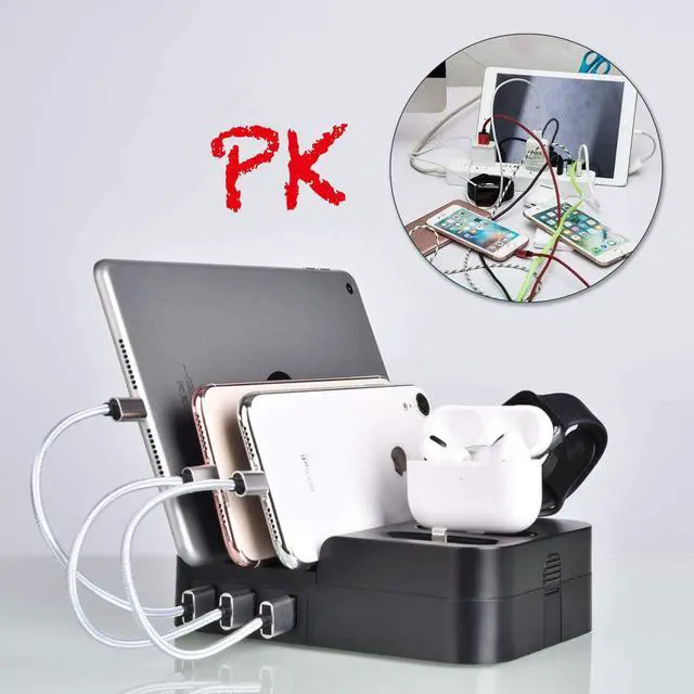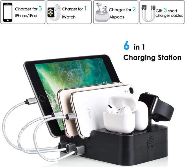 MUZHI Universal 6-Port USB Charging Station Dock with 3 USB Charge& Sync Wires Leads to more convenience. Fastest charging your and your friend/ family's cell phones, New Macbook, iWatch, AirPods, tablets and other PD laptop. Perfect for home,dorm,school, hotels or office!