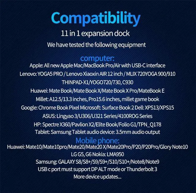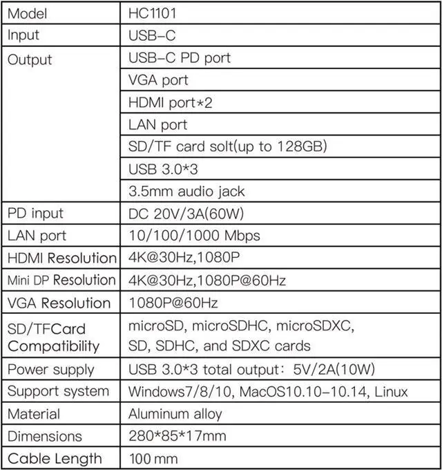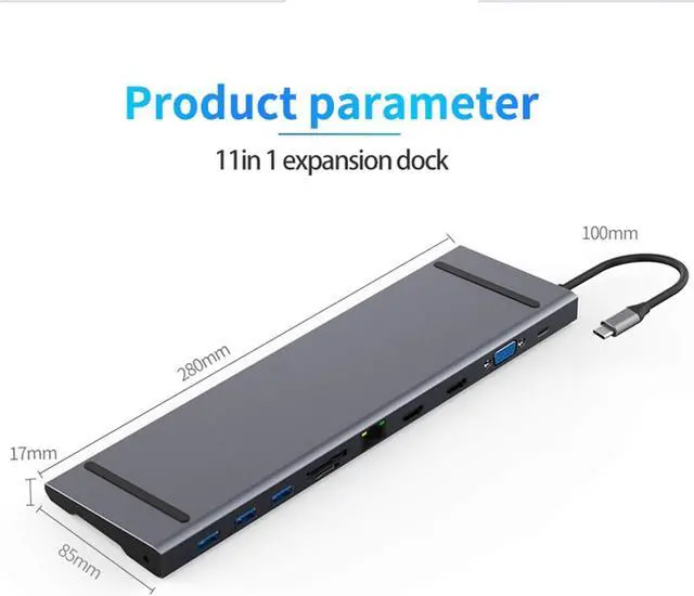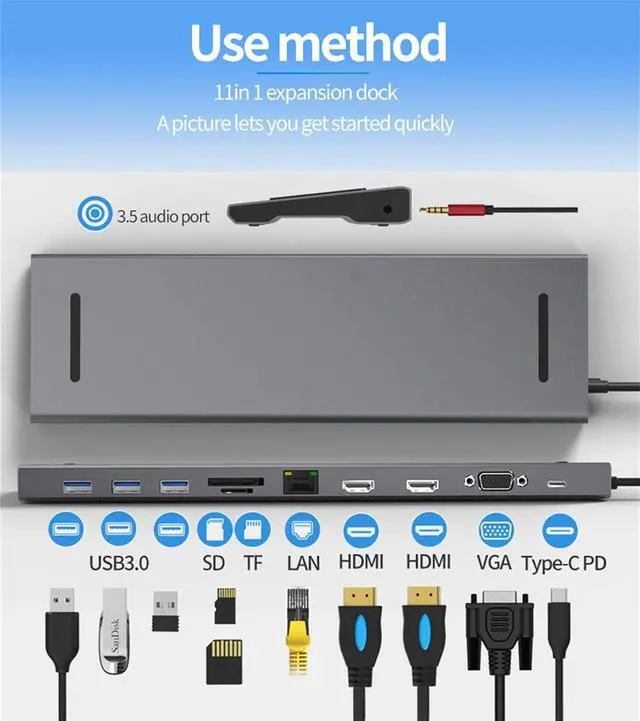 Double HDMI Type: USB 3.0x2+HDMIx2+VGA+RJ45+TF/SD+3.5mm Jack+ PD (11 Ports)