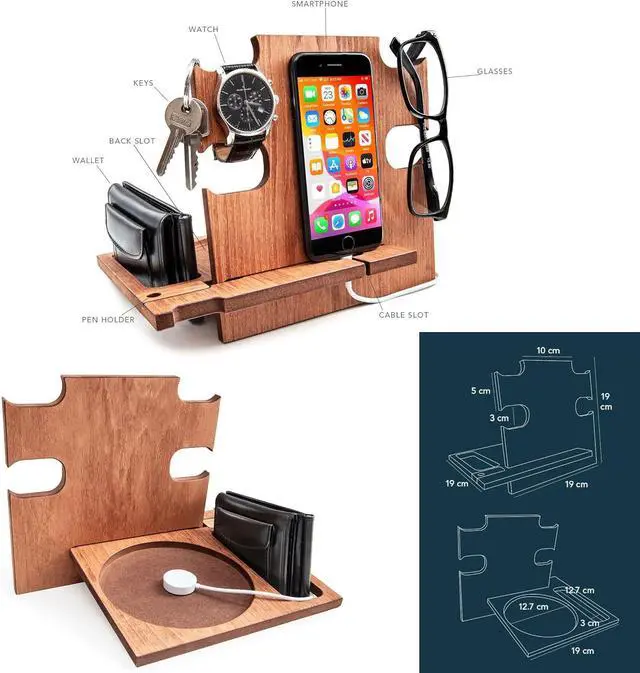 -This docking station is a great solution to keep all your daily items organized and easy to find. It was designed to keep your smartphone, your tablet, keys, watch, glasses, wallet, everything is organized in a series of spaces specifically designed.