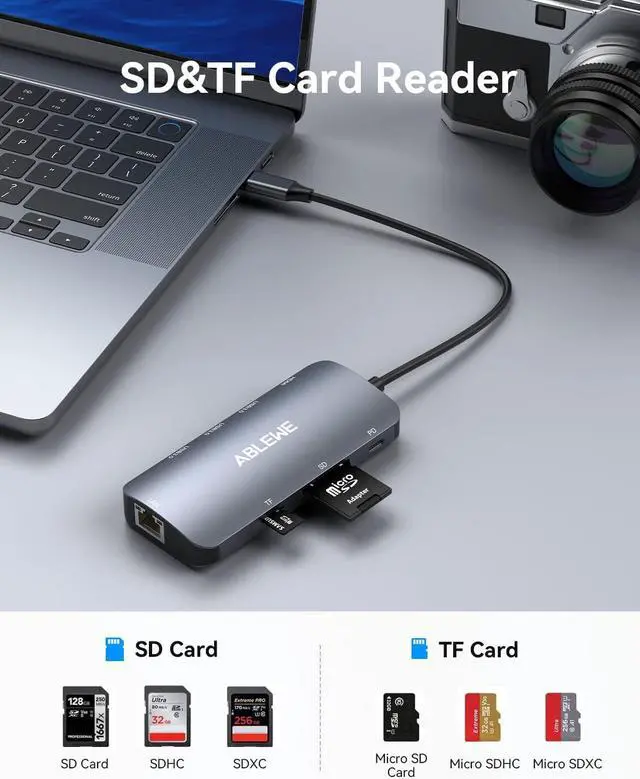 • 1000M Ethernet & SD/TFABLEWE usb c multiport adapter built in SD and TF slots easily access files from universal SD card and Micro SD card. USB c hub support 2 cards reading simultaneously. The usb c to ethernet adapter ensures