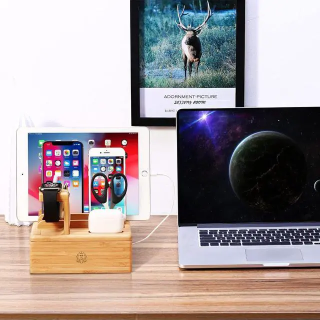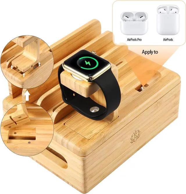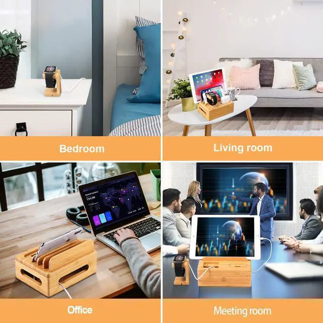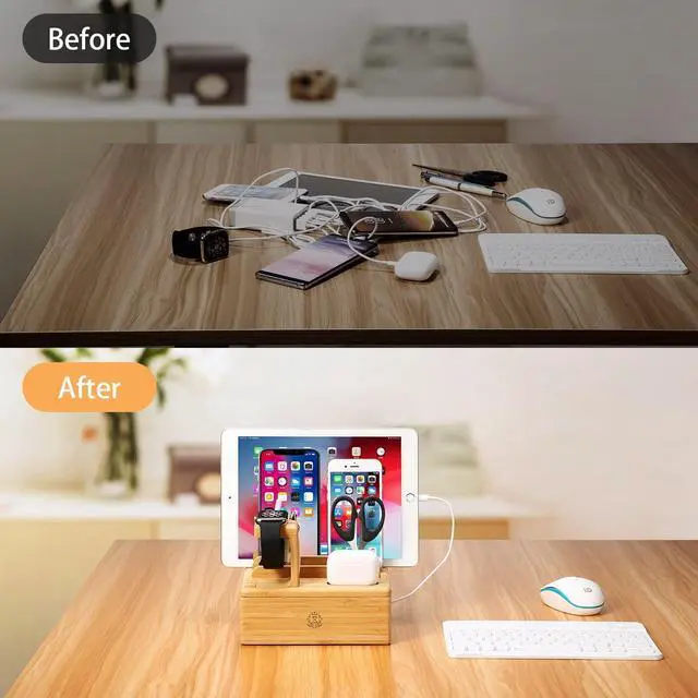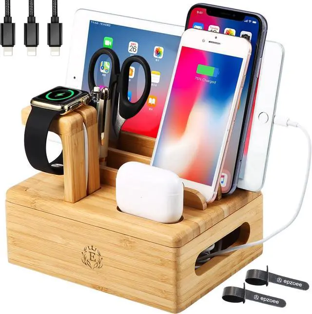 Bamboo Charging Stations for Multiple Devices, Upgrade Desk Docking Station Organizer for Cell Phones, Tablet, AirPods, iWatch Stand-B4