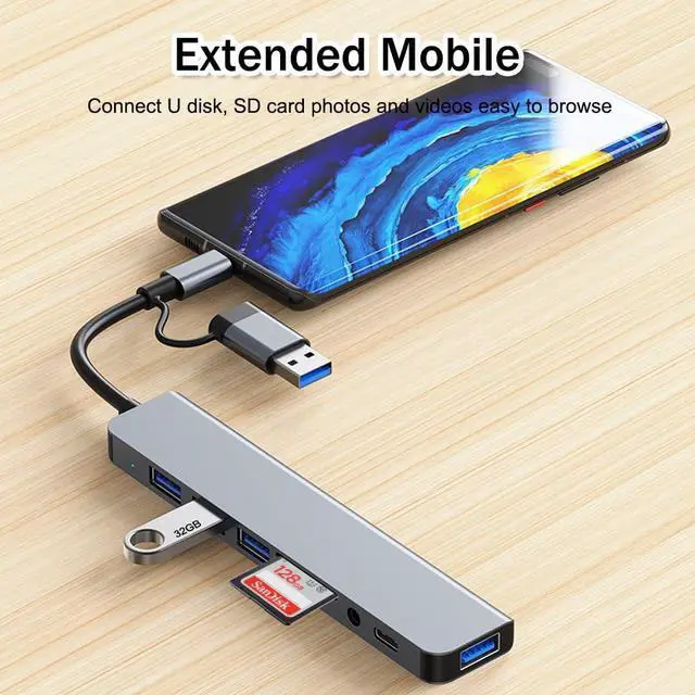 USB C HUB can transfer video data for cross device playback,create a private theater,connect your phone/tablet to TV and enjoy watching movies/games with an immersive big screen view,it can also make your phone/tablet switch to a"computer"in seconds,making mobiIe office more convenient.(Note:mobiIe phones/tablets must support the OTG function.)