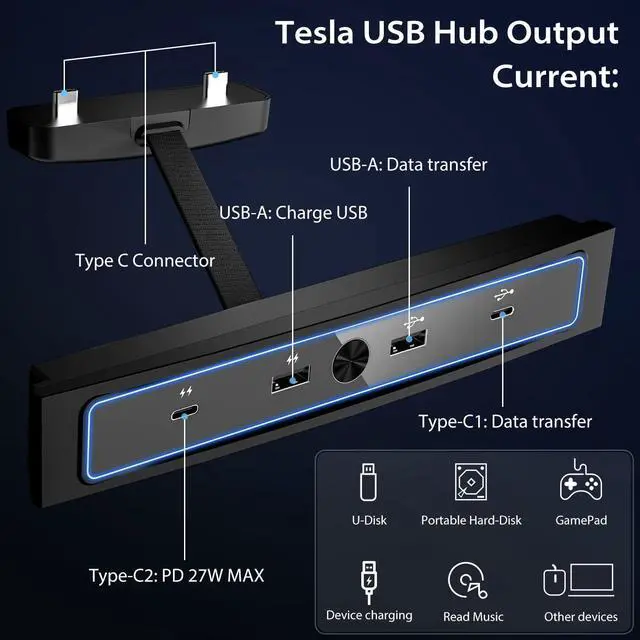 Tesla Model 3/Y 2021-2023 USB Hub 4-in-1 Multiport Center Console Adapter Accessories, Tesla USB Hub Docking Station, Car USB Charger with 2 USB Port and 2 Type-C Port, Supports 27W PD Car Charging