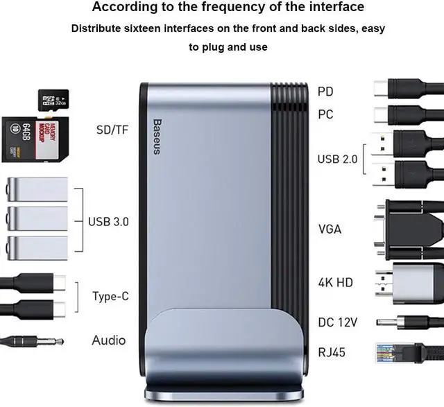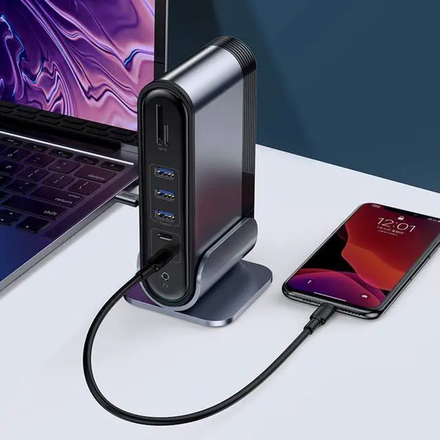 One-stop upgrade for Windows tablets, laptops or desktops. This USB C docking station can provide a convenient connection for the extended workspace; connect a C-type laptop with 2 screens (HDMI + VGA + laptop), Ethernet, C-type PD port, C-type PC port, DC power supply Port, 2 C-type ports, 3 USB3. 2 USB2.0, SD / Micro SD card readers, a 3.5mm stereo audio input and output, all connected through a USB-C cable.
