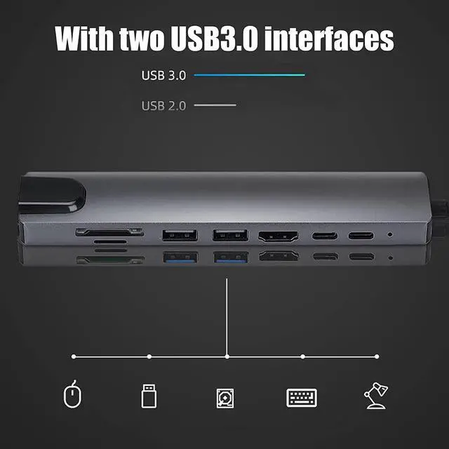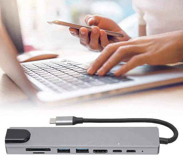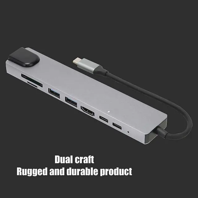 2. No driver or software is required, plug and play. Convert your usbc port into 8 ports: 2 x TypeC, 2 x USB2.0, HighDefinition Multimedia Interface, RJ45, Memory Card, Storage Card
