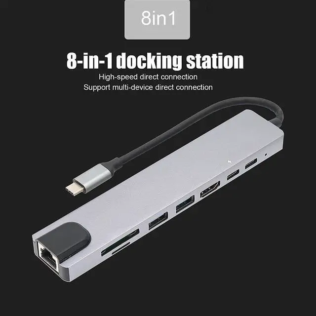 • No driver or software is required, plug and play. Convert your usbc port into 8 ports: 2 x TypeC, 2 x USB2.0, HighDefinition Multimedia Interface, RJ45, Memory Card, Storage Card