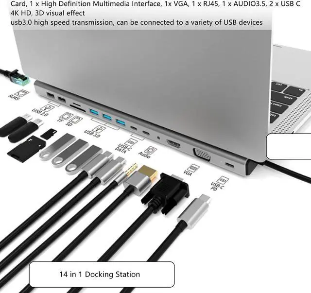 Laptop Docking Station, 14 in 1 Type C Hub with 3 USB3.0 +2 USB2.0+PD+SD+TF+HDMI+VGA+RJ45+AUDIO3.5+2 USB C Multiport Adapter Dongle Compatible for OS X, Windows, Android