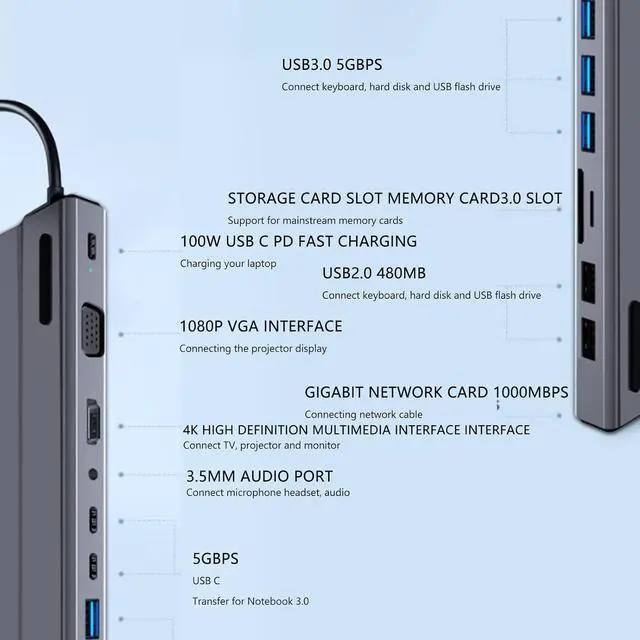 Interface Type: Type C to 3 x USB3.0, 2 x USB2.0, 1 x PD,1 x Storage Card, 1 x Memory Card, 1 x High Definition Multimedia Interface, 1x VGA, 1 x RJ45, 1 x AUDIO3.5, 2 x USB C